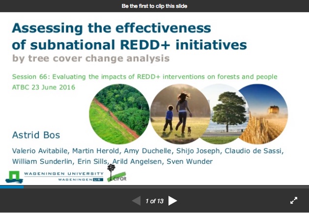 This presentation was given by Astrid Bos Valerio Avitabile, Martin Herold, Amy Duchelle, Shijo Joseph, Claudio de Sassi, William Sunderlin, Erin Sills, Arild Angelsen, Sven Wunder at the Annual Meeting of the Association for Tropical Biology and Conservation in Monpellier 2016.