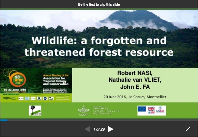 Presentation by Robert Nasi, Director of the CGIAR Research Program on Forests, Trees and Agroforestry, et al. at the Annual Meeting of the Association for Tropical Biology and Conservation in Montpellier, France, 19-23 June 2016.